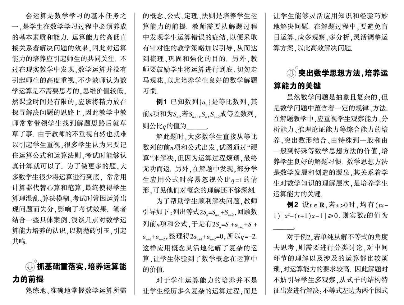 [摘 要] 在高中数学教学中,部分教师为了追求“容量和速度”,常常形成思路后就不了了之,忽视了学生运算能力的培养. 这样不仅影响了学生成绩的提升,而且限制了学生思维能力的发展,影响了学生数学核心素养的落实. 在实际教学中,教师应把培养学生的运算能力落到实处,通过适时讲解、适当练习、有效思(剩余3561字)