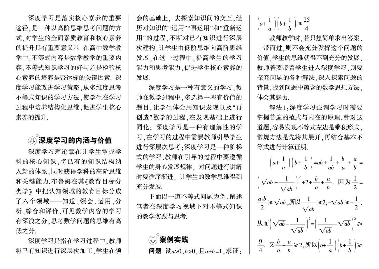 [摘 要] 深度学习是在理解学习的基础上发展高阶思维的内源性学习.深度学习是落实数学核心素养的重要途径,也是提高学生学习能力和思考水平的必经途径. 文章基于深度学习理论,结合一个不等式问题,引导学生关注问题的多元表征,在学习过程中感悟数学,提高学生分析问题、解决问题的能力.
