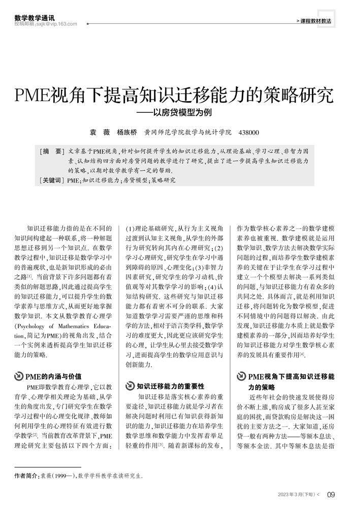 [摘 要] 文章基于PME视角,针对如何提升学生的知识迁移能力,从理论基础、学习心理、非智力因素、认知结构四方面对房贷问题的教学进行了研究,提出了进一步提高学生知识迁移能力的策略,以期对数学教学有一定的帮助.