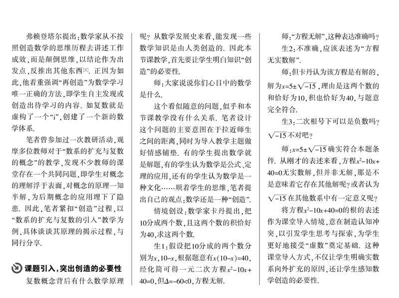 [摘 要] 数学学习并不是让学生被动接受知识的过程,而是从学生原有认知经验出发,实现知识主动建构的过程. 弗赖登塔尔倡导的“发现与再创造”对数学教学具有指导意义. 文章认为,经历“创造”过程,优化数学教学的措施有:课题引入,突出创造的必要性;注重探索,探寻创造的途径;完善认知,验证创造的(剩余4795字)