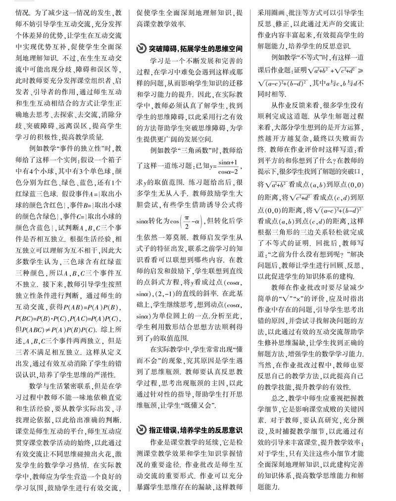 [摘 要] 在数学教学中,若忽视教学细节可能出现考虑不周、懂而不会、一错再错等现象,从而影响学生的解题信心,限制学生发展. 在数学教学中,教师应关注教学细节,通过巧妙引导、有效交流、正确反馈来激发学生的主体性,帮助学生突破思维障碍,提高课堂教学质量.