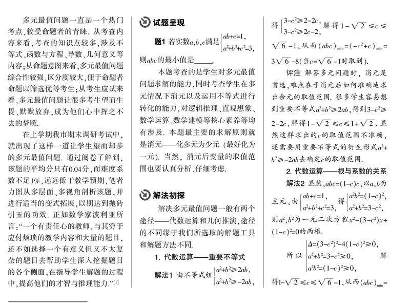 [摘 要] 文章以一道期末调研填空压轴题为例,通过一题多解,引导学生从多方面深入探究多元最值问题的求解方法;通过变式拓展训练,加深学生对多元最值问题处理方法的理解,提升学生的发散思维能力;通过教学反思,深度品味例题带给大家的教学启示.
