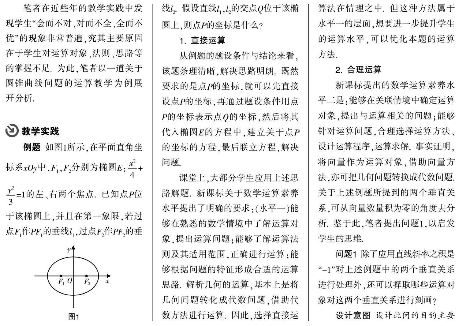 [摘 要] 对于同一个问题,不同运算思路导致的运算量有着天壤之别,尤其在解决解析几何问题时,运算思路的选择与优化异常重要. 研究者以一道关于圆锥曲线问题的运算教学为例,探讨不同运算思路所带来的不同运算过程,并就此从“明确运算对象”“设计运算思路”“探寻症结所在”“寻求矫正方法”“优化运算(剩余3073字)