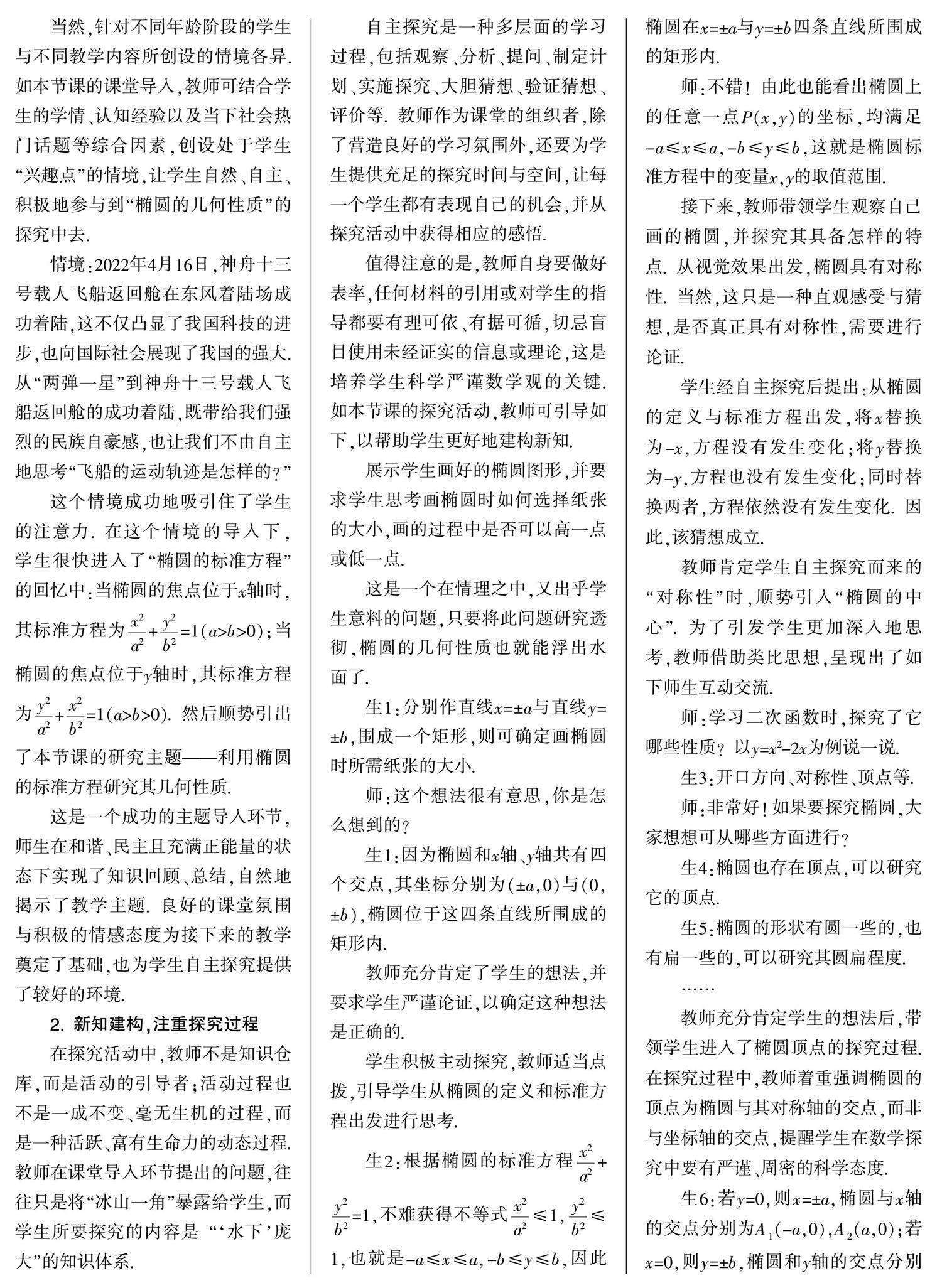 [摘 要] 自主探究模式能最大化地挖掘学生的潜能,培养学生的探究能力与创新意识. 文章从自主探究模式的现状分析着手,以“椭圆的几何性质”的教学为例,从以下四方面展开分析:情境导入,引发探究兴趣;新知建构,注重探究过程;活动总结,提炼探究成果;加强应用,强化探究反思.