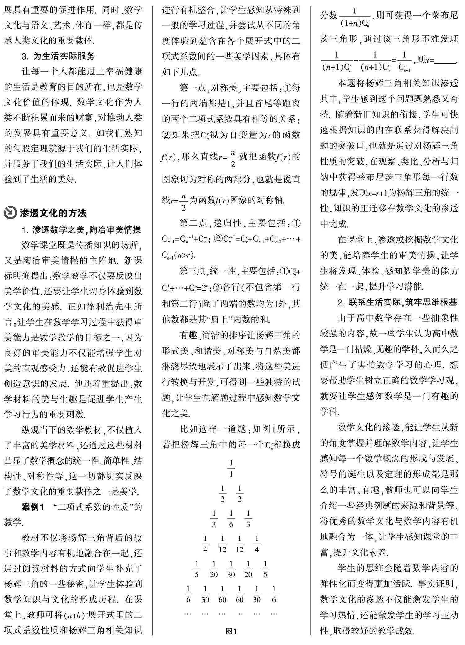 [摘 要] 数学文化涵盖了数学教育、数学学科发展以及数学应用等维度的内容体系,具有培养人才、传承文化,为现实生活服务等作用. 文章从如下四方面具体谈谈数学文化的渗透方法:渗透数学美,陶冶审美情操;联系生活实际,筑牢思维根基;呈现知识的创造历程,培养坚毅品格;改革教学方式,满足发展需求.