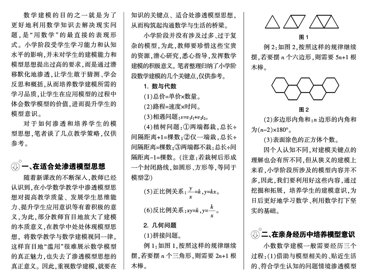 [摘 要] 模型思想的形成是一个长期的过程,在日常教学中要不断地启发、渗透和引导。在小学阶段,为了培养学生的模型思想,往往需要在关键点、适合处进行渗透,通过问题情境引导学生在切身体验中学会概括和抽象,借助猜想、验证、应用,逐渐形成模型思想,进而提升数学素养,提高解题效率。