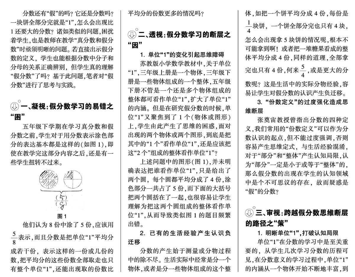 [摘 要] 假分数是学生分数学习中的一个认知难点,从定义上看,学生很容易辨别,但对假分数的本质并未真正理解,甚至容易和生活实际产生认知冲突。笔者基于学生假分数学习的易错之“困”,解析思维断层之“因”,探寻跨越假分数思维断层的有效路径。