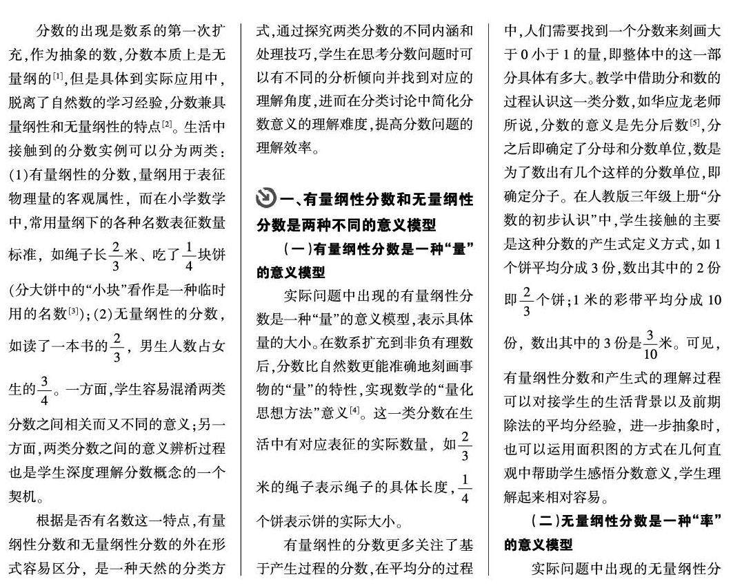 分数的出现是数系的第一次扩充,作为抽象的数,分数本质上是无量纲的[1],但是具体到实际应用中,脱离了自然数的学习经验,分数兼具量纲性和无量纲性的特点[2]。(剩余5205字)