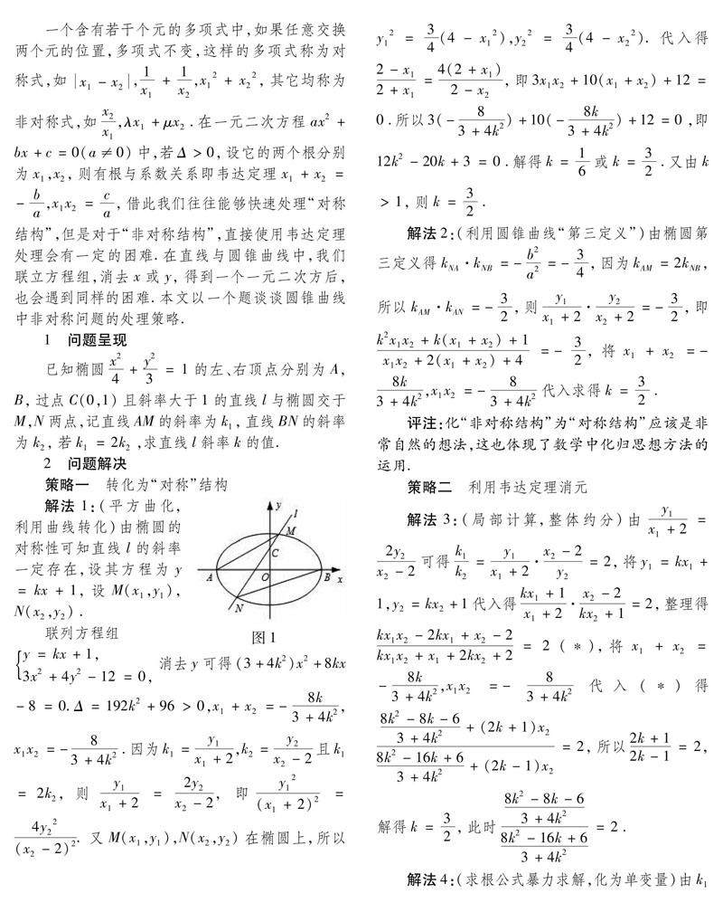 一个含有若干个元的多项式中,如果任意交换两个元的位置,多项式不变,这样的多项式称为对称式,如x1 -x2 ,1/x1 + 1/x2 ,x1 2 + x2 2,其它均称为非对称式,如x2/x1,λx1+μx2.在一元二次方程ax2+bx+c=0(a≠0)中,若Δ>0,设它的两个根(剩余234字)