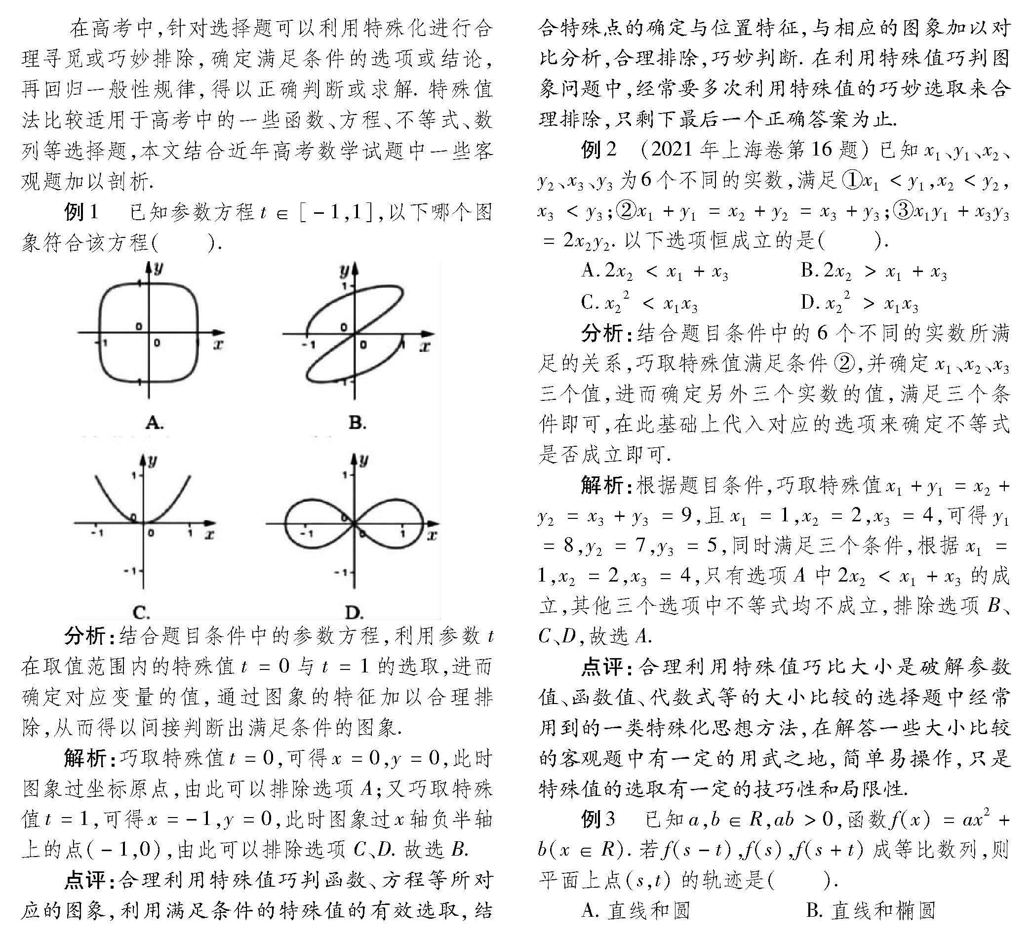 在高考中,针对选择题可以利用特殊化进行合理寻觅或巧妙排除,确定满足条件的选项或结论,再回归一般性规律,得以正确判断或求解.特殊值法比较适用于高考中的一些函数、方程、不等式、数列等选择题,本文结合近年高考数学试题中一些客观题加以剖析.