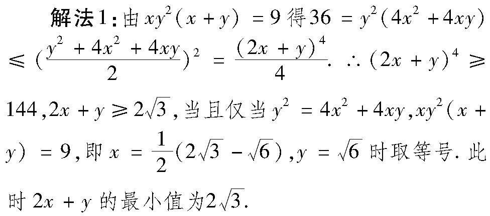 (2023届高三武汉市重点高中4月联考第16题) 已知正实数x,y满足xy2(x+y)=9,则2x+y的最小值为 .