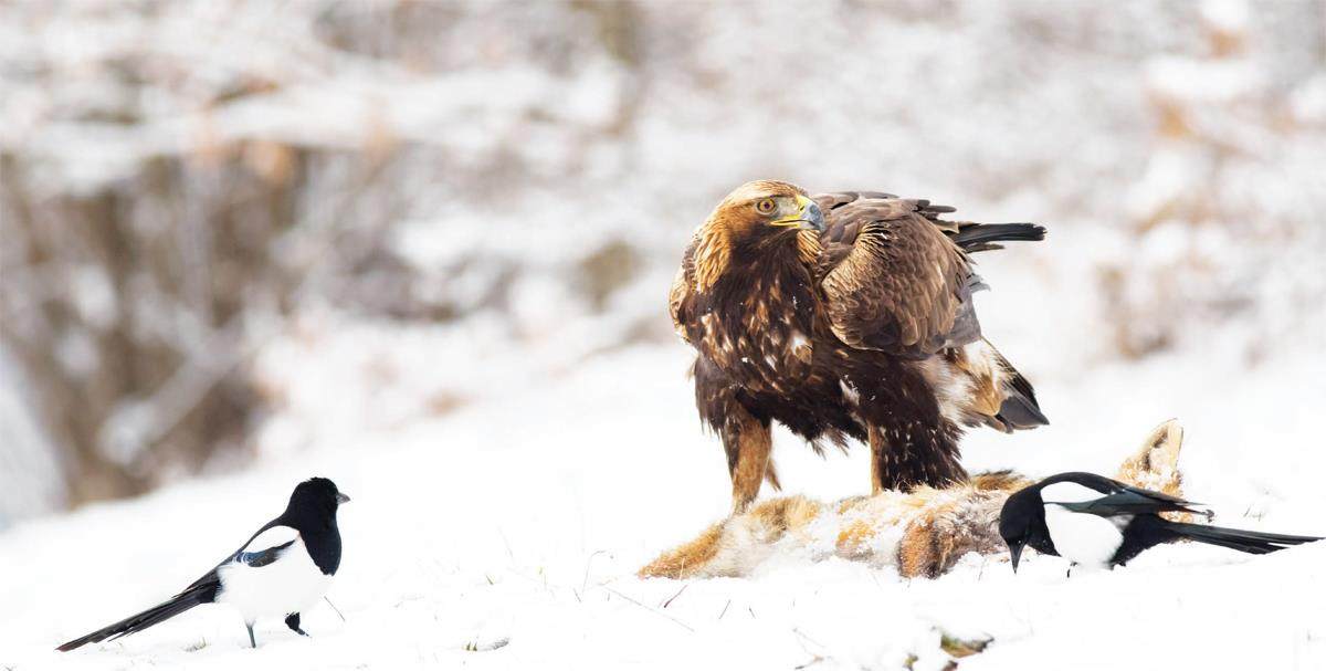 “这只狐狸个头儿还不小,接下来的几天就都不会挨饿了。”金雕边吃边想,并用翅膀把狐狸盖起来,生怕被其他捕食者发现了。