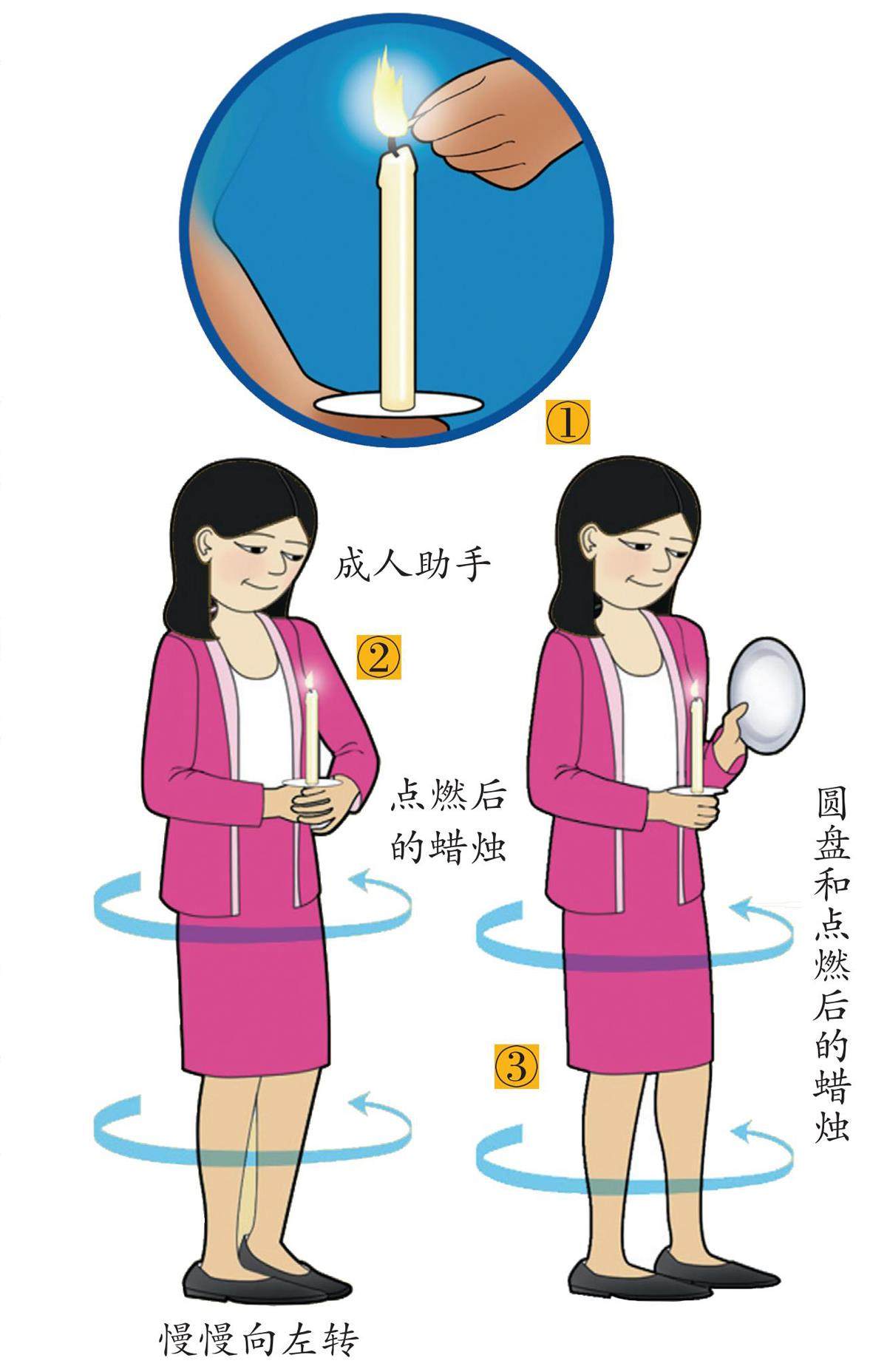 第二步:由成人助手拿着蜡烛,让蜡烛位于身体正前方,慢慢向左转。火苗发生了什么变化?沿相同方向移动还是相反方向移动?