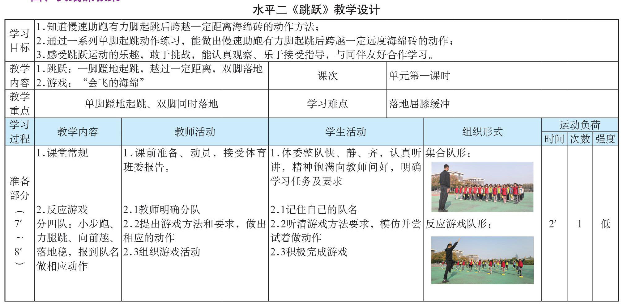 本课以“小步跑”“力腿跳”“向前越”“落地稳”跳跃小分队为故事情境进行设计,通过“单脚连续跳”“前踢腿跳”“高抬腿跳”的运用,渗透跳远技能。(剩余778字)