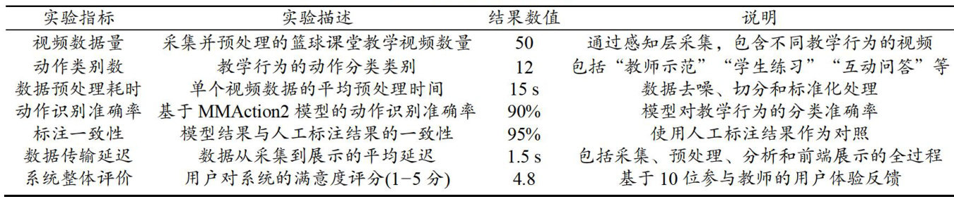Abstract:Leveraging the advanced MMAction2 model,the study applies it forthe first time to the evaluation of teaching behavior in physical education clasroom, and designs a complete system encompassing multi-inteligence algorithm analysisand visual feedback functions,soas to achieve automation and intellgence from data collection to behavior analysis.This research shows that this system consists of four core modules such as the perception layer (responsible for data collection and input),the platform layer (for data processing and storage),the model layer (for behavior recognition and analysis),and the application layer (providing data visualization and result feedback),and these modules efficiently collaborate to construct a comprehensive evaluation system for teaching behavior. Andpractical tests demonstrate that this system achieves a 92% accuracy rate in behavior recognition and a 95% consistency between analysis results and manual annotations in basketballclassroom teaching, which significantly enhances the eficiency and accuracy of teaching and evaluation.