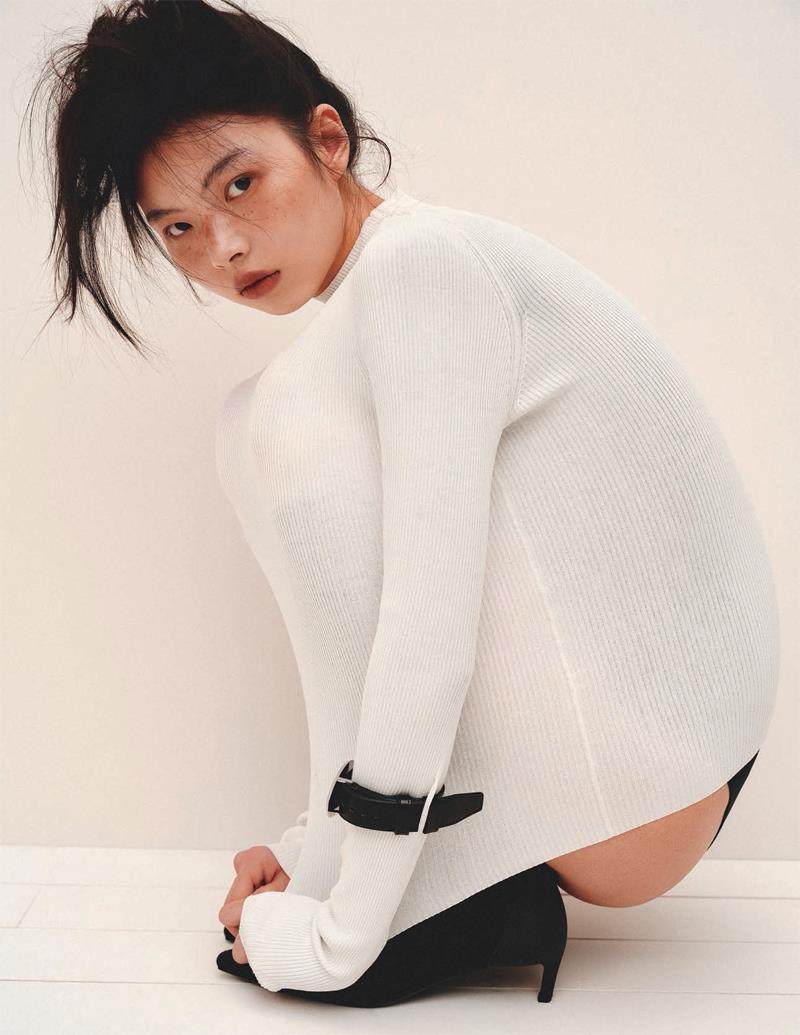 白色高领上衣Tory Burch;米色羊绒针织长裤、百褶裙、长袖针织衫均为Loro Piana:白色夹趾中筒靴Miu Miu