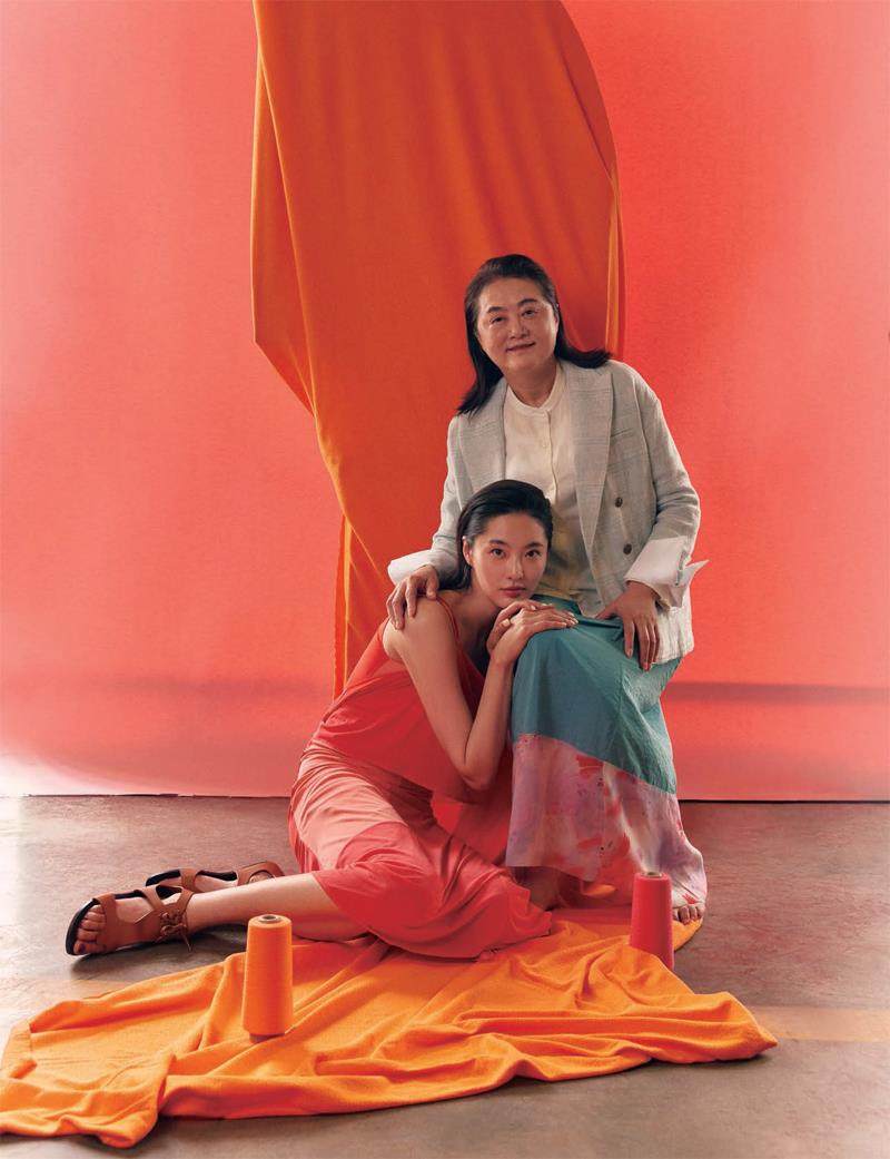 陈碧舸:拼接连衣裙、皮质凉鞋均为Hermes橙色布景布使用环保无水染色技术。