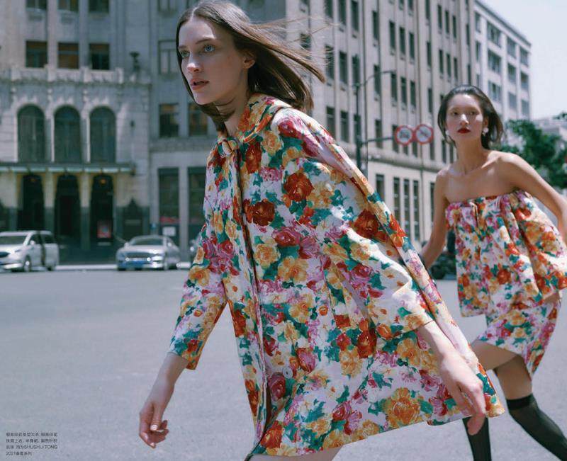 黑色吊带连身衣 SHUSHU/TONG 2024春夏系列,红色发夹,耳环 均为SHUSHU/TONG 2025秋冬系列;蓝色花朵吊带连身衣 SHUSHU/TONG 2024春夏系列