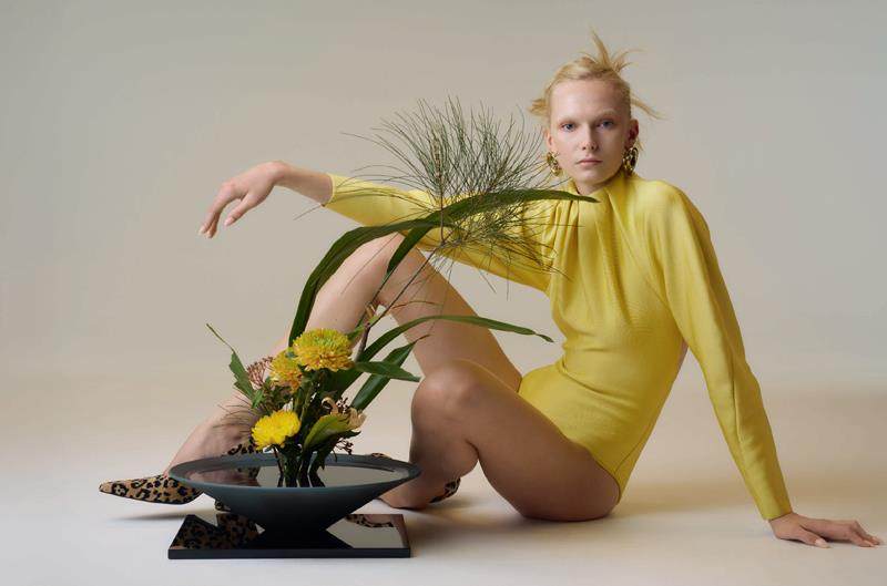 黄色连体衣、金色耳环均为Givenchy by Sarah Burton;豹纹植绒高跟鞋 Mark Gong
