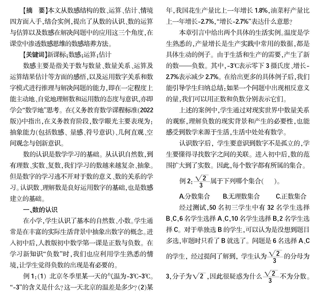 【摘 要】本文从数感结构的数、运算、估计、情境四方面入手,结合实例,提出了从数的认识、数的运算与估算以及数感在解决问题中的应用这三个角度,在课堂中渗透数感思维的数感培养方法。