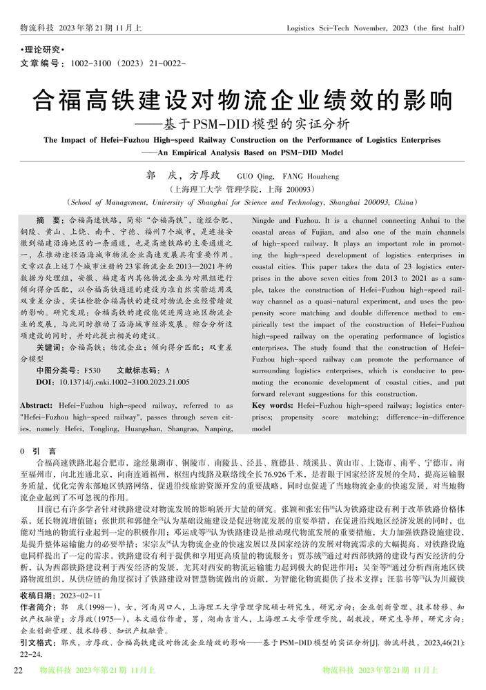 摘 要:合福高速铁路,简称“合福高铁”,途经合肥、铜陵、黄山、上饶、南平、宁德、福州7个城市,是连接安徽到福建沿海地区的一条通道,也是高速铁路的主要通道之一,在推动途径沿海城市物流企业高速发展具有重要作用。文章以在上述7个城市注册的23家物流企业2013—2021年的数据为处理组,安徽、福建省内其他物流企业为对照组进行倾向得分匹配,以合福高铁通道的建设为准自然实验运用及双重差分法,实证检验合福高铁的建设对物流企业经营绩效的影响。(剩余4937字)