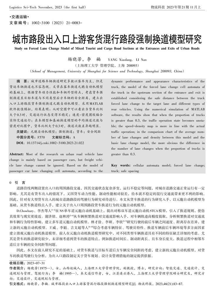 摘 要:城市道路车辆换道研究多数以客车为主,但是货运车辆换道也不容忽视。文章在客车换道元胞自动机模型的基础上,根据货车动力性能和车辆外型特点,考虑货车强制换道至目标车道与不同类型后方车辆的安全距离,建立出入口上游路段货车强制换道元胞自动机模型。采用MATLAB软件数值模拟,结果表明:从时空图中可以看出当货车比例大于0.3时,交通运行状态变得不稳定;速度-密度图较贴合实际交通运行;在本模型和基础换道模型的平均换道次数与密度对比图中,货车比例大于0.3时,换道次数差异越明显。(剩余4544字)