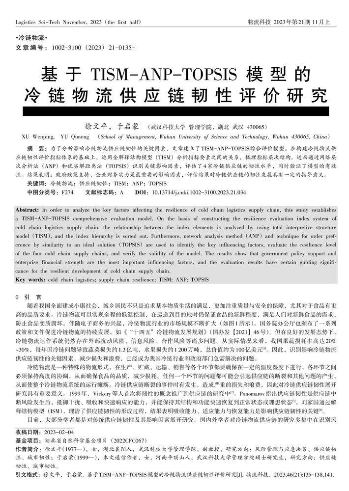 基于TISM-ANP-TOPSIS模型的冷链物流供应链韧性评价研究