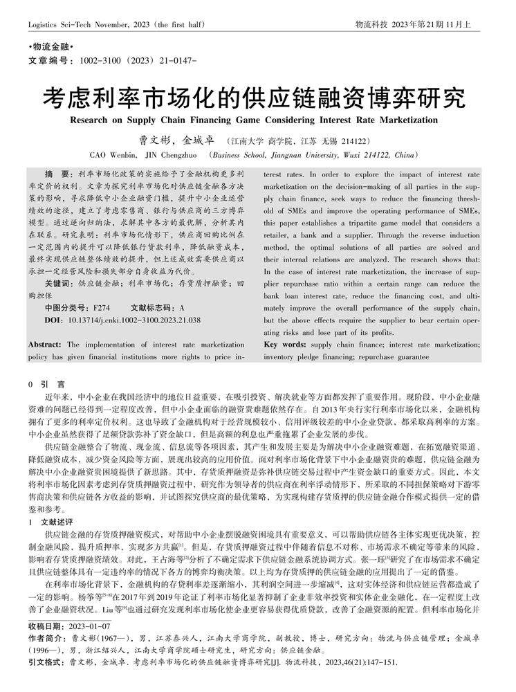 摘 要:利率市场化政策的实施给予了金融机构更多利率定价的权利。文章为探究利率市场化对供应链金融各方决策的影响,寻求降低中小企业融资门槛,提升中小企业运营绩效的途径,建立了考虑零售商、银行与供应商的三方博弈模型。通过逆向归纳法,求解其中各方的最优解,分析其内在联系。研究表明:利率市场化情形下,供应商回购比例在一定范围内的提升可以降低银行贷款利率,降低融资成本,最终实现供应链整体绩效的提升,但上述成效需要供应商以承担一定经营风险和损失部分自身收益为代价。(剩余4952字)
