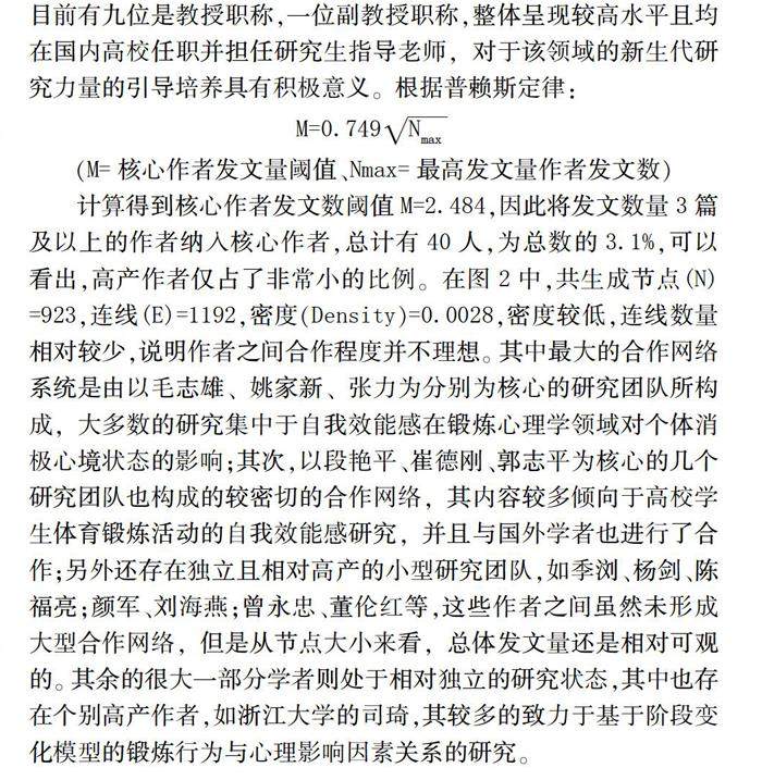 摘要:为深入探索国内体育领域的自我效能感研究热点及发展趋势,本文运用CiteSpace软件对中国知网、万方、维普数据库中共511篇核心期刊文献进行可视化分析。主要结论:当前国内体育领域自我效能感研究态势呈相对稳定状态,但在近几年核心期刊发文量略有减少;作者、机构合作研究合作程度不理想;研究方向总体侧重于竞技体育运动、学校体育教学,对于大众体育锻炼方面研究热度兴起相对较晚;长期重点关注的对象群体主要为运动员,大学生、青少年等年轻群体,近几年对中老年人及教师、医生等不同职业人员的关注逐渐增多。(剩余8386字)