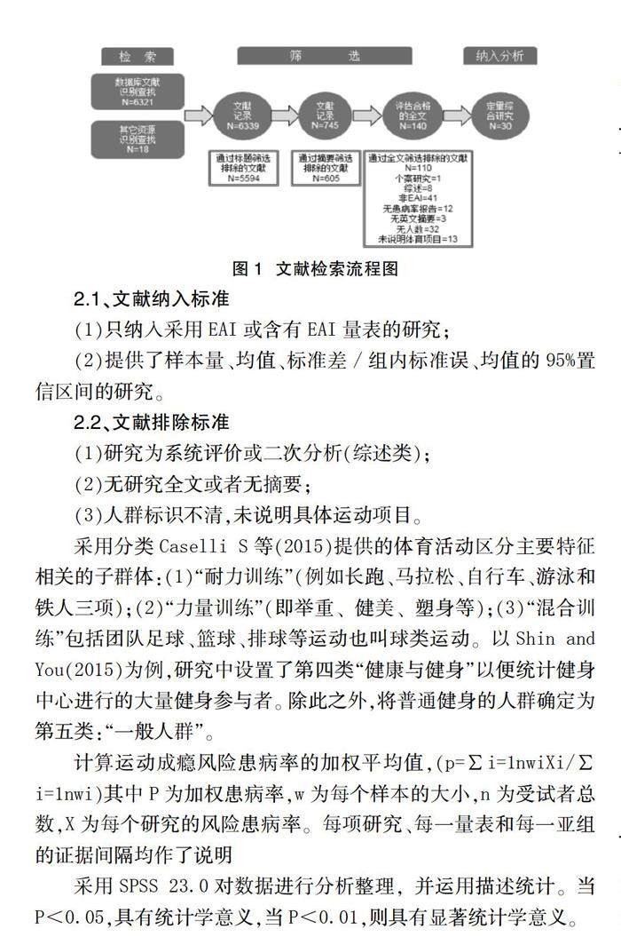 摘要:过度的体育锻炼可能演变为运动成瘾,不同项群运动项目的特点与运动成瘾的患病率的关系仍需要进一步探索。方法:系统回顾了2000年1月1日至2018年12月31日的现有文献,收集所有采用运动成瘾量表(EAI)筛查运动成瘾的研究。结果:已有研究中30项使用EAI报告了运动成瘾率。EAI指出,普通人群运动成瘾率为5.3%。(剩余8676字)