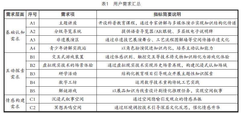 摘 要:博物馆作为社会教育的重要载体,传统单一的展览模式已难以有效发挥文化传承与公众教育作用。研究通过构建包含基础认知、互动探索、情感构建三个维度的11项需求指标体系,运用KANO模型和Better-Worse系数将需求划分为必备型、期望型、魅力型等5类,并确定其优先级排序。根据数据分析结果提出打造“展—讲—演”复合空间、构建叙事导向的展游体系、营造冥想式文化感知空间、植入交互游戏与虚拟现实技术四个展教融合空间的设计策略。(剩余5587字)