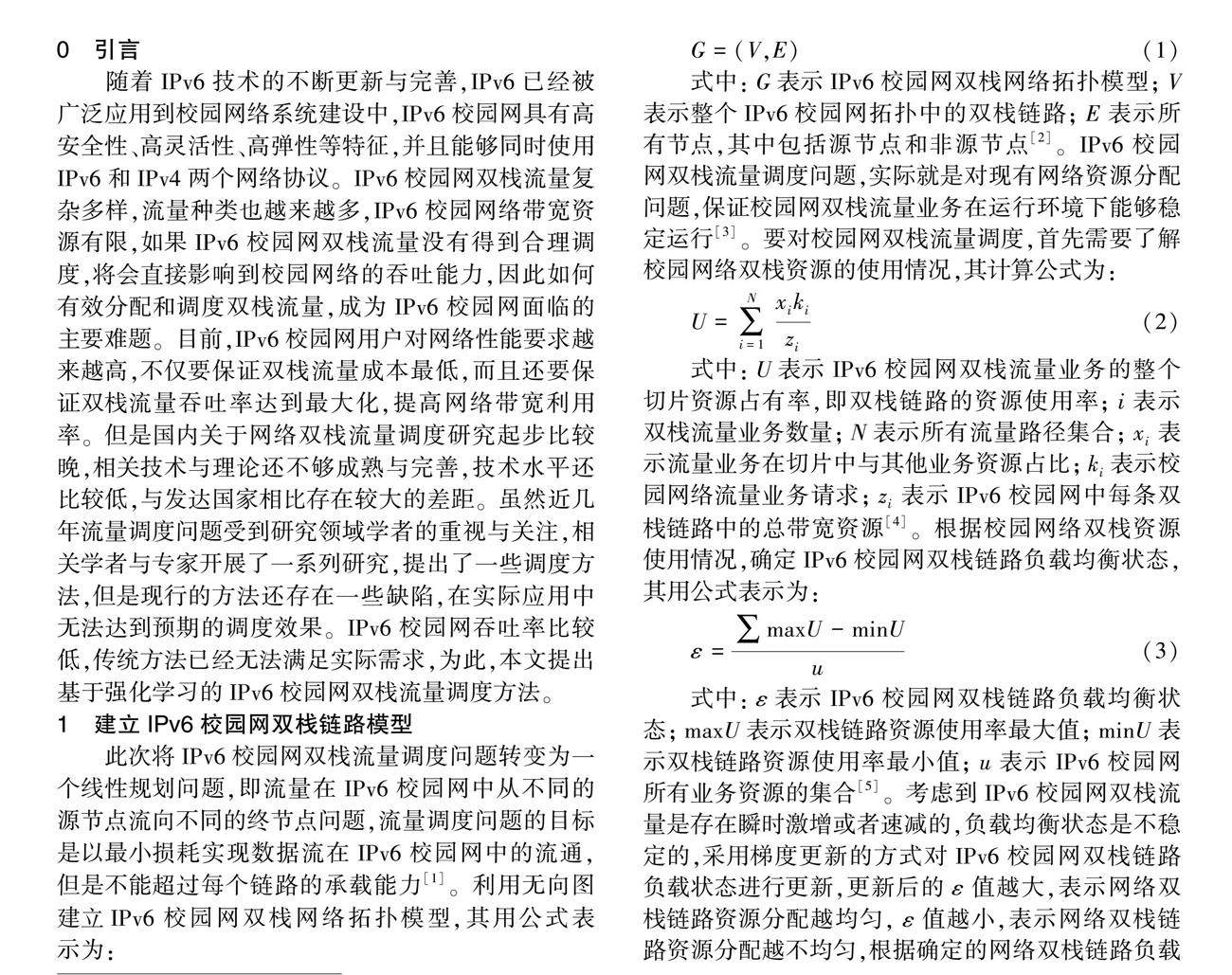 摘要:由于传统方法在IPv6校园网双栈流量调度应用中效果不佳,网络吞吐率比较低,文章提出基于强化学习的IPv6校园网双栈流量调度方法,利用无向图建立IPv6校园网双栈链路拓扑模型,描述双栈链路负载均衡状态,以负载均衡度最大化、双栈链路路径长度最小化为目标建立目标函数,利用强化学习网络模型对目标函数求解,将最优调度策略反馈到模型中执行,以此实现基于强化学习的IPv6校园网双栈流量调度。(剩余5439字)