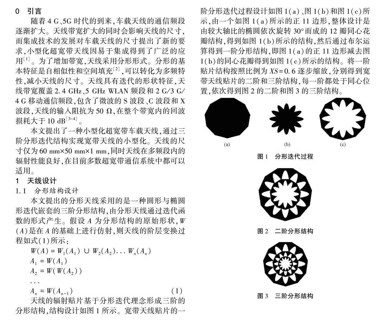 摘要: 针对当前车载系统尺寸较大、工作带宽较窄以及窄带通信系统对超宽带系统存在干扰的问题,文章设计了一款超宽带 (Ultra-Wideband,UWB)天线,天线采用小型化超宽带设计,尺寸仅为 60 mm×50 mm×1 mm,辐射贴片采用一种圆形与椭圆形迭代嵌套的三阶分形结构以实现良好的超宽带特性,并通过50 Ω微带馈线产生了2.1~10 GHz频段的特性。(剩余3996字)
