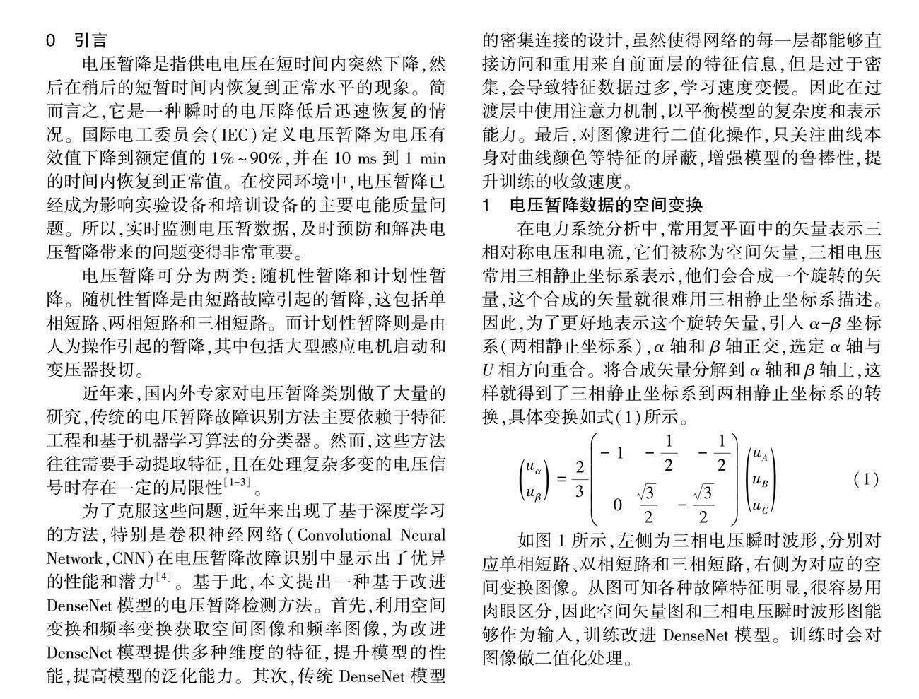 摘要:为了解决电力系统中常见的电压暂降故障的识别问题,文章提出了一种基于改进DenseNet模型的识别方法。首先,将电压信号从时域空间转换到频率空间,并对瞬时电压进行空间坐标变换,将三维静止坐标系转换到二维静止坐标系。其次,将二维坐标矢量轨迹图、电压瞬时波形图和频率空间图像作为改进DenseNet模型的输入,并对这些图像进行二值化处理。(剩余4750字)