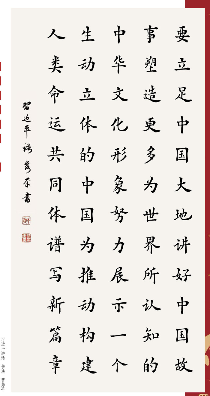要立足中国大地,讲好中国故事,塑造更多为世界所认知的中华文化形象,努力展示一个生动立体的中国,为推动构建人类命运共同体谱写新篇章。