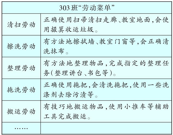 为了加强劳动教育,我创设了“劳动菜单”,把学生需要掌握的劳动技能以清晰的条目展现出来,让学生在明确的目标下劳动,掌握技能后“考级”,并把劳动教育延伸到学生的家庭生活中。