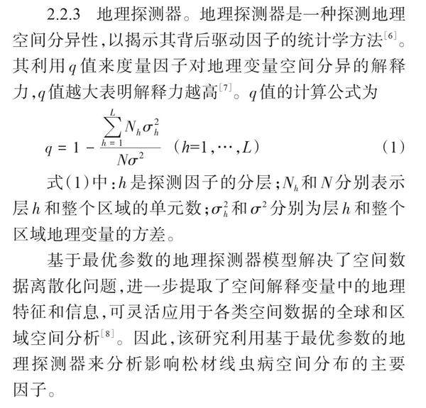 摘 要:以安徽省黄山市休宁县为研究区域,采用地理信息系统(Geographic Information Systems,GIS)研究松材线虫病的空间分布规律及其与地形、河流和人类活动等因子间的关系,并利用基于最优参数的地理探测器模型筛选出对松材线虫病空间分异影响最大的因子。结果表明:2022年休宁县松材线虫病的重灾区和中灾区主要集中在东临溪镇、榆村乡、山斗乡和海阳镇,部分中灾区分布于万安镇、商山镇、五城镇和源芳乡;休宁县松材线虫病主要分布在高程600 m以下、坡度5°~35°、距河流800 m以内、人类活动强度低的区域,疫情分布与坡向间的关系不明显;高程对松材线虫病空间分异的解释力最高,是影响休宁县松材线虫病空间分异的重要因子。(剩余5153字)