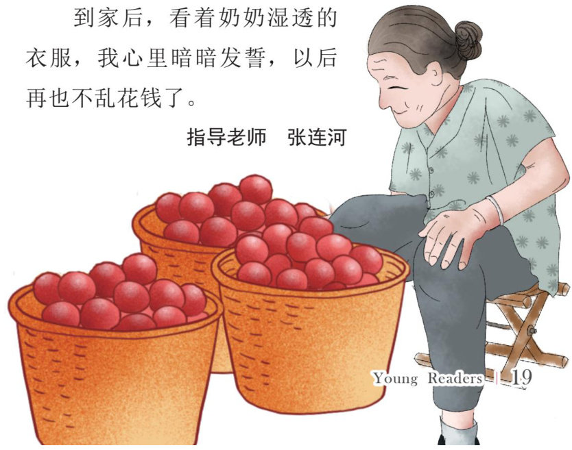 那天早饭后,爷爷奶奶把三筐苹果装上三轮车。我搬来一个小板凳,坐在苹果筐旁边。然后,奶奶就开着三轮车,向集市进发。一路上,闻着苹果的芳香,我的心脏咚咚乱跳,心想一定要把苹果卖光……