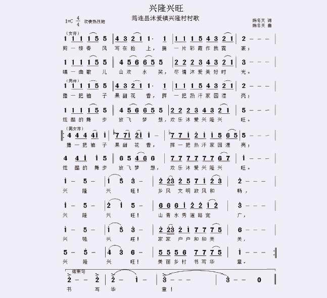 歌曲《兴隆兴旺》作者曾任沐爱镇兴隆村驻村第一书记,在这期间坚持以文化扶贫为重要抓手,积极开展文化建设和文明创建工作。通过走访村民收集大量素材,创作村歌《兴隆兴旺》,唱美丽乡村文明新风。以热情洋溢的词曲,抒发沐浴在党的关怀、政策温暖下的兴隆村人,迈步向前,挥洒热汗,撸起袖子加油干,建设美丽新家园,为乡村振兴贡献兴隆力量的坚定决心!该歌曲被宜宾市妇联作为全市“美好家园”建设项目的主题歌向全市每个村社区推广,受到人民群众喜爱。(剩余45字)