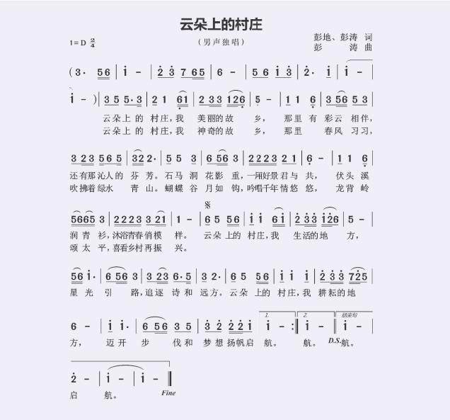 歌名即画面——“云朵上的村庄”悬在长宁县双河镇海拔千米处,常年云带绕山,恍若天空之村。词人彭地以石马洞、伏头溪、蝴蝶谷、龙背岭四景为轴,把“彩云”“花影”“青衫”“月钩”写进句子,三阕歌词层层递进:先写“故乡的芬芳”,再写“神奇的山水”,终写“耕耘与远方”,完成从“归处”到“出发”的情感闭环。作曲家彭涛采用抒情慢板,悠扬的曲调像云隙透出的阳光,明亮却不刺眼。(剩余94字)