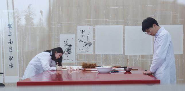每个工作日的下午,在苏州吴文化博物馆一楼的书画装裱修复室,身着白大褂的马鸣远和王铭钰正专注修复馆藏书画作品。透过一块透明的玻璃,观众可以实时观看里面的修复工作。在长3米、宽1.8米的裱画案上沉浸于伏案修复,仿佛外界的一切都和他们没有关系,此刻,他们与文物进行一场无声的对话。