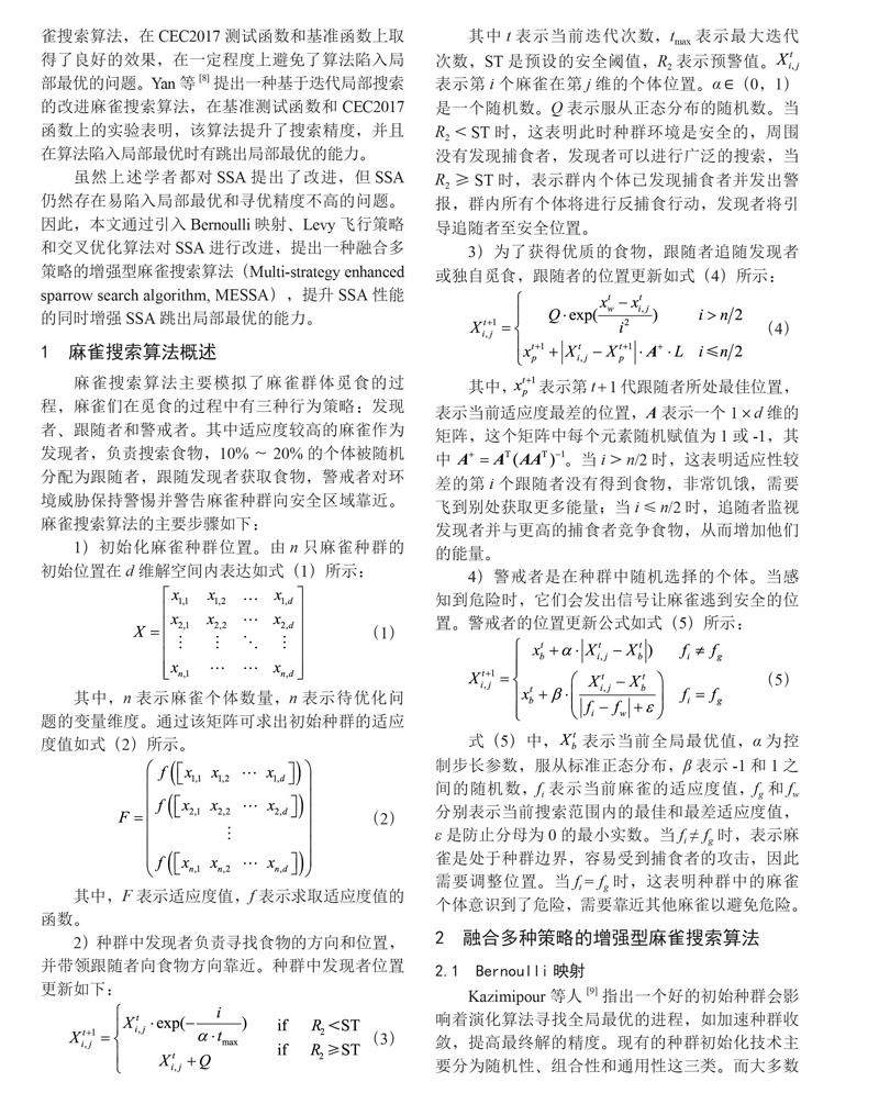 摘 要:为进一步提升麻雀搜索算法(SSA)的收敛速度和求解精度,并且针对麻雀种群的全局搜索能力较弱和在迭代后期易陷入局部最优的问题,提出一种多策略增强型的麻雀搜索算法(MESSA)。首先,采用Bernoulli映射初始化种群,保证种群的多样性和均匀性,提升算法的收敛速度。其次,引入Levy飞行来增强麻雀种群中个体发现者的全局搜索能力。(剩余9665字)