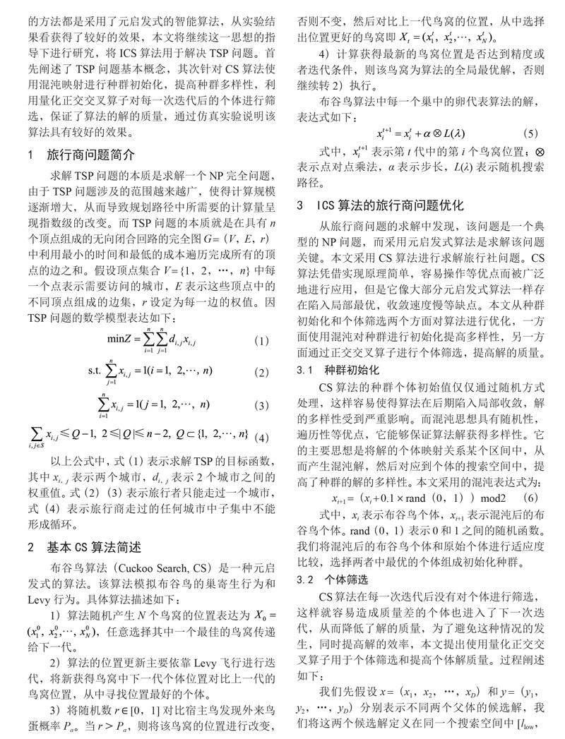 摘 要:旅行商问题(Traveling Salesman Problem, TSP)是一个NP问题。为了能够获得最优的路径长度以及降低运行时间,文章使用改进的布谷鸟算法(Improved Cuckoo Search, ICS)进行旅行商问题的优化。首先阐述了TSP问题的定义,其次采用布谷鸟算法(Cuckoo Search, CS)进行优化:使用混沌映射进行种群初始化,提高种群多样性;利用量化正交交叉算子对每一次迭代后的个体进行筛选,保证了算法解的质量。(剩余6089字)