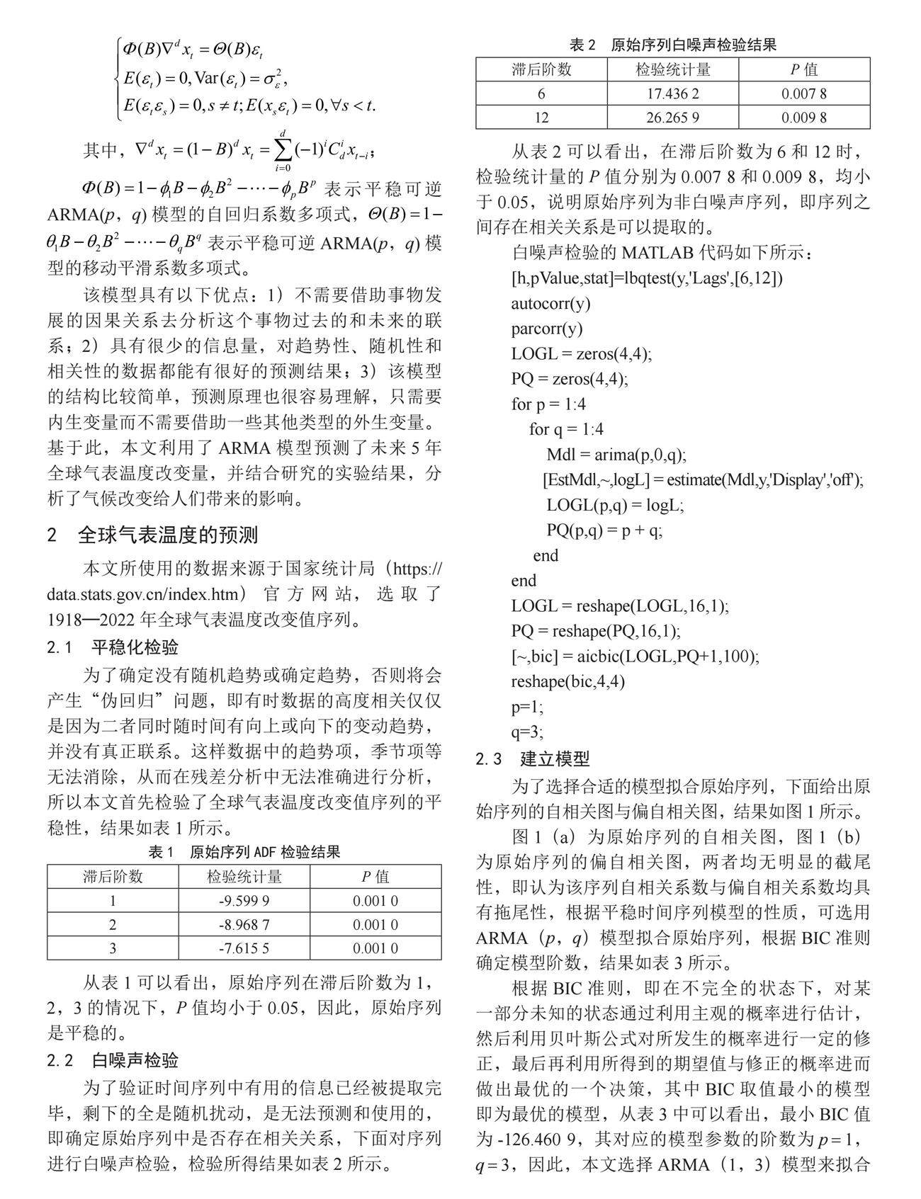 摘 要:现如今,由于人们在日常的生产以及生活中对化石燃料越来越依赖,温室气体的排放量逐年增多,以致全球变暖的速度也越来越快。为了减少气候变化对人们产生的影响,文章对1918—2022年的全球气温数据进行了平稳化检验和白噪声检验,建立了一个ARMA(1,3)模型,并利用该模型预测了未来5年全球气表温度改变量,结合实验结果,分析了气候改变给人们带来的影响,最后给予了应对全球气候变暖的建议。(剩余5690字)