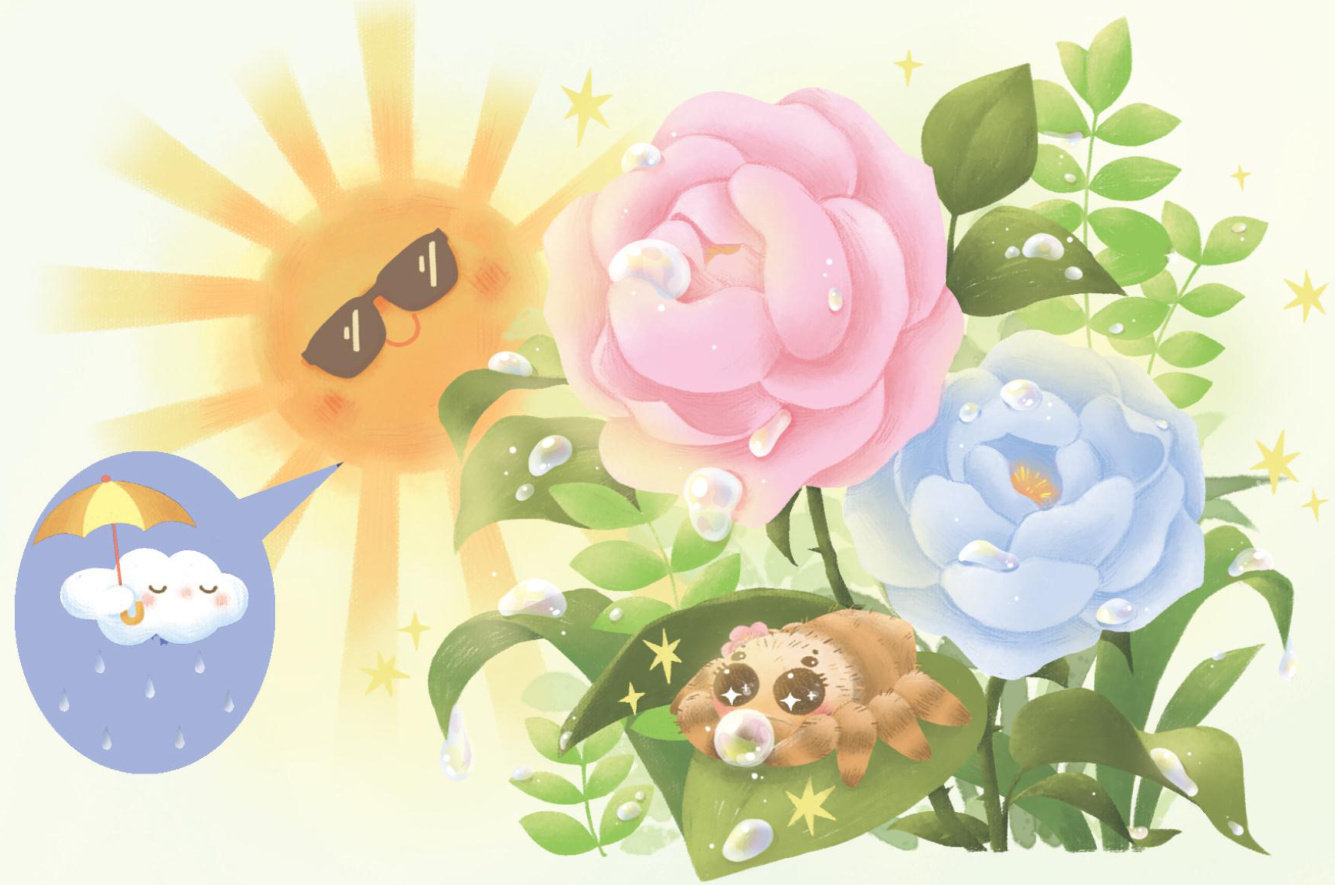 qing chénzhi zhu xiao jié zāi yué ji huā fáng ziI xing lái lān yāo gāng 清晨,蜘蛛小姐在月季花房子里醒来。懒腰刚 shén le yi bantä jiu lengzhu le lu zhu you bu jian ledao di shi shéitou 伸了一半,她就愣住了:“露珠又不见了,到底是谁偷 zóu le wó de lu zhu 走了我的露珠?”