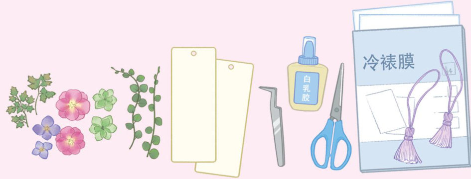 压好的花瓣和绿叶、空白书签,镊子、白乳胶、剪刀、冷裱膜、流苏