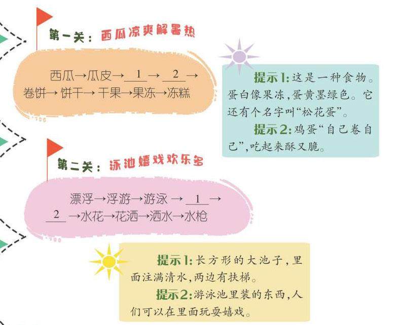 我猜,你一定是个喜欢玩词语接龙的豆苗儿!暑假的午后,烈日当空,找个凉快的地方,一起玩词语接龙游戏吧!请试着根据提示补全空白处的词语