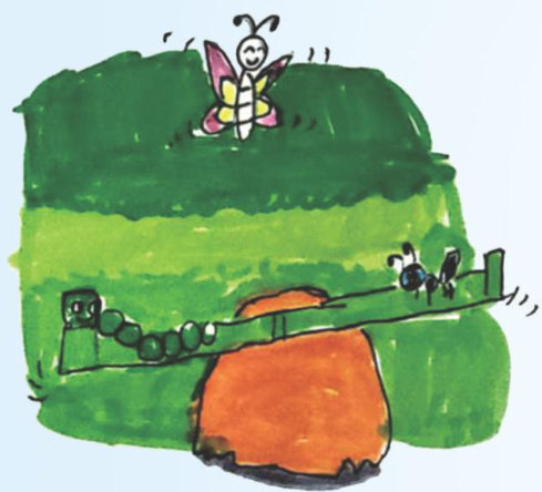 毛毛虫、小蚂蚁和小蝴蝶在草地上发现了半个鸡蛋壳。他们找来一块绿色的木板,搭在鸡蛋壳上,做成一个好玩的晓跷板。