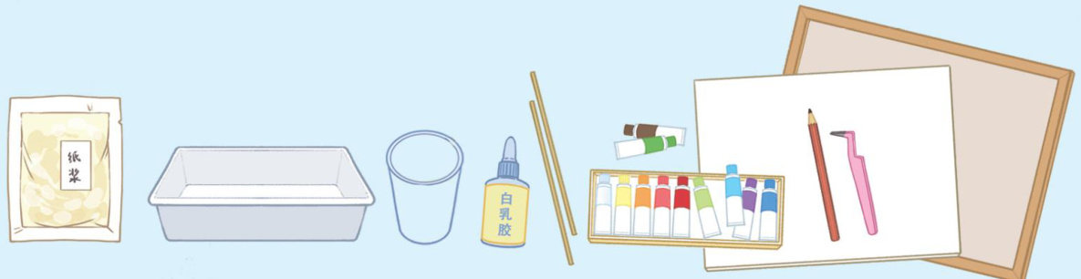 纸浆、搅拌槽、透明杯、白乳胶、小棒、各色颜料、A4尺寸硬纸板、铅笔、镊子、画框。