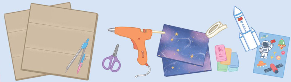 硬纸壳、圆规、剪刀、热熔胶枪(含热熔胶)、星空图纸、双面胶、黏土、火箭模型、航天贴纸
